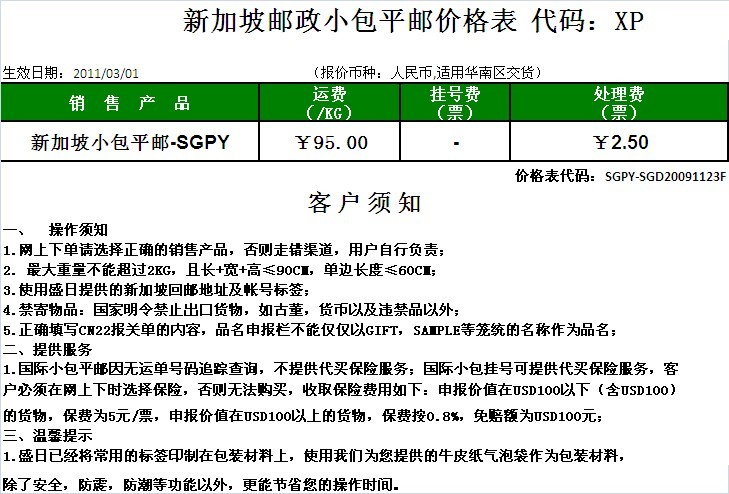 電子商務B——新加坡郵政小(xiǎo)包平郵價格表