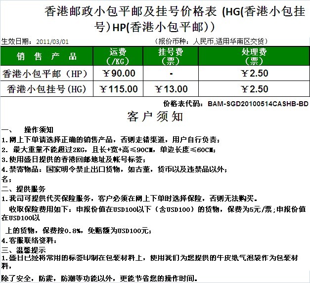 電子商務C——香港郵政小(xiǎo)包平郵及挂号價格表