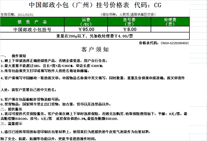 電子商務E——中國郵政小(xiǎo)包(廣州)挂号價格表